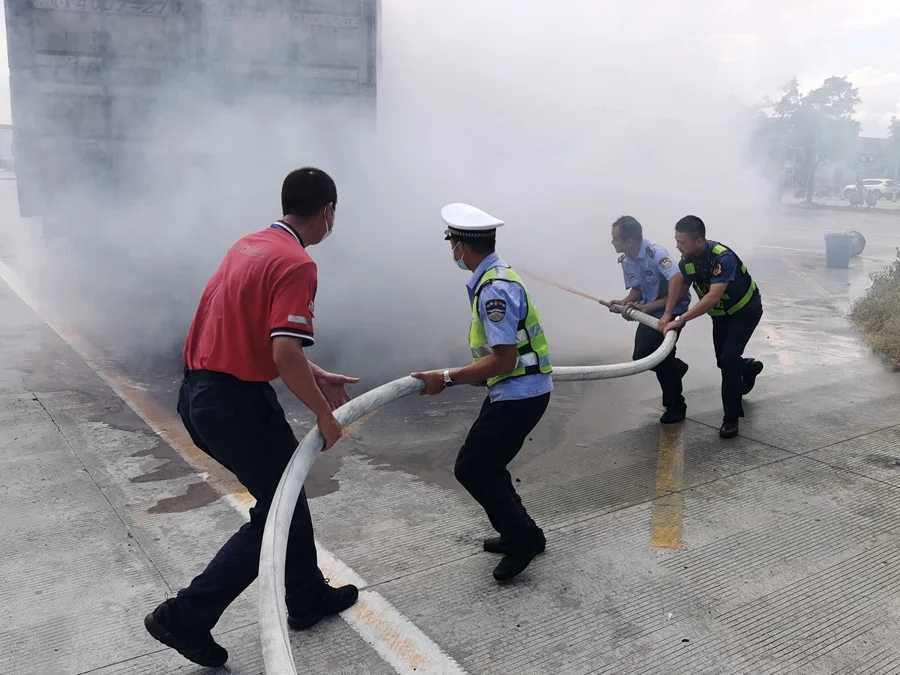 當(dāng)天15時(shí)20分,廣東交通集團(tuán)所屬揭博高速路政員張威權(quán)、胡堃巡查至石壩服務(wù)區(qū)時(shí),發(fā)現(xiàn)一輛半掛式貨車右后方燃起熊熊烈火。兩人上報(bào)監(jiān)控通知消防救援后馬上開始滅火。為提高救援效率,胡堃負(fù)責(zé)對(duì)現(xiàn)場進(jìn)行安全圍蔽,疏散周圍人員、車輛,并在服務(wù)區(qū)入口指揮后面車輛提前避讓;張威權(quán)則與司機(jī)、服務(wù)區(qū)協(xié)管員相互配合,從就近消防設(shè)施取出干粉滅火器滅火。但是火勢太大,越燒越烈。持續(xù)燃燒下去,不僅車輛、貨物會(huì)化為灰燼,要是發(fā)生爆燃,更會(huì)危及周邊人、車安全。危急關(guān)頭,張威權(quán)和協(xié)管員跑到就近的消防栓,一人連接管道閥門,另一人拖動(dòng)消防水帶和水槍奔向著火車輛。大家握住水槍發(fā)起“猛攻”,10分鐘后,大火終于被撲滅,事故沒有造成人員傷亡。