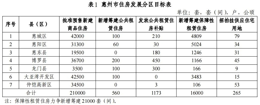 該規(guī)劃意見稿指出,在未來兩年內(nèi),惠州市擬批準(zhǔn)預(yù)售新建商品住房21萬套左右,招拍掛供應(yīng)住宅用地265公頃左右;新增籌建公共租賃住房560套,發(fā)放租賃補(bǔ)貼1173戶,新增籌建保障性租賃住房不少于16000套(間),力爭達(dá)到21000套(間);住房公積金新開戶職工人數(shù)34.25萬人,住房公積金新增繳存額170.86億元,切實(shí)有效地保障各階層市民在惠安居。