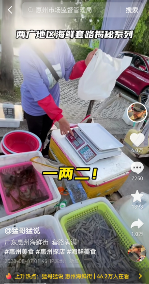 8月7日凌晨,網(wǎng)紅博主@猛哥猛說在抖音發(fā)布視頻曝光了惠州澳頭海鮮市場部分海鮮攤檔缺斤少兩的問題。在視頻中,部分路邊海鮮檔主存在的“鬼秤”、帶水稱重、使用加厚塑料袋等現(xiàn)象引發(fā)網(wǎng)友廣泛關(guān)注和熱烈討論。