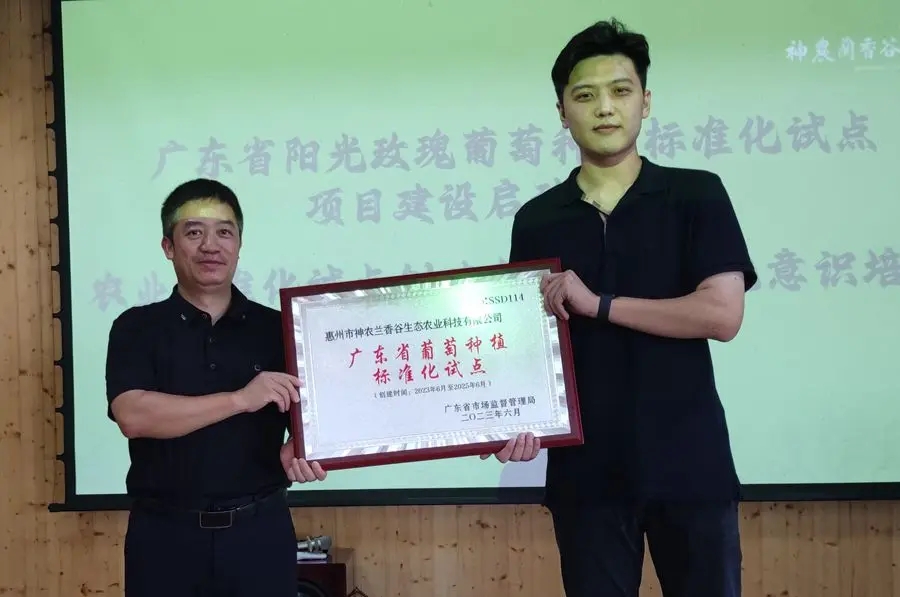 啟動(dòng)儀式上,惠州市市場(chǎng)監(jiān)督管理局相關(guān)負(fù)責(zé)人向神農(nóng)蘭香谷項(xiàng)目負(fù)責(zé)人頒授“廣東省葡萄種植標(biāo)準(zhǔn)化試點(diǎn)”牌匾。這是廣東省市場(chǎng)監(jiān)督管理局下達(dá)的2023年度29項(xiàng)省農(nóng)業(yè)標(biāo)準(zhǔn)化試點(diǎn)項(xiàng)目之一。