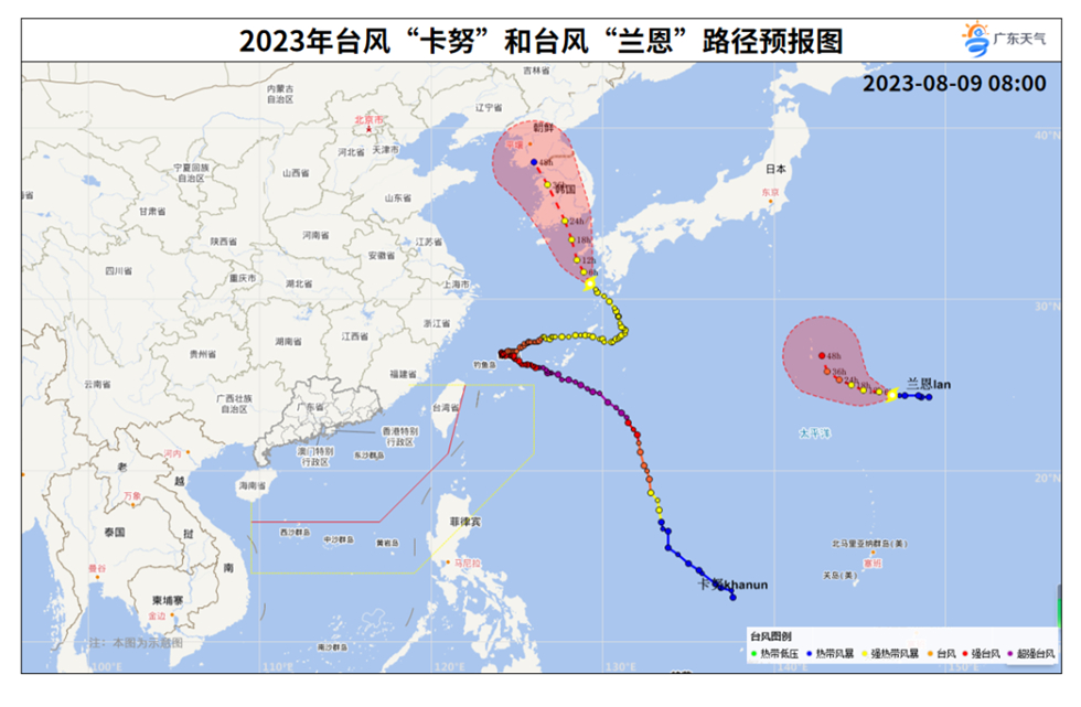未來幾天,臺風“卡努”趨向朝鮮半島,隨后影響我國東北地區(qū)。8月10日起,吉林、黑龍江等地將有較強降雨,計劃去東北旅游的朋友要多留意當?shù)靥鞖狻E_風“蘭恩”趨向日本,強度將繼續(xù)加強。