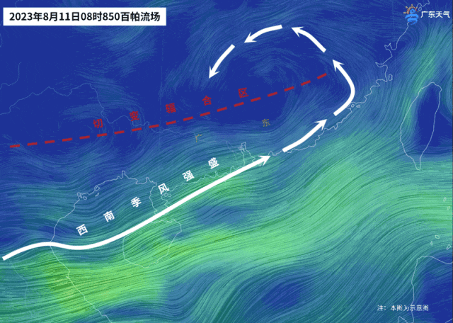 雖然兩個臺風都不來廣東,但也會間接給廣東帶來一些降雨。從8月11日的流場圖可見,雙臺風北上的同時,位于南海的西南季風也有所北抬,季風云團將會爬上華南沿岸。