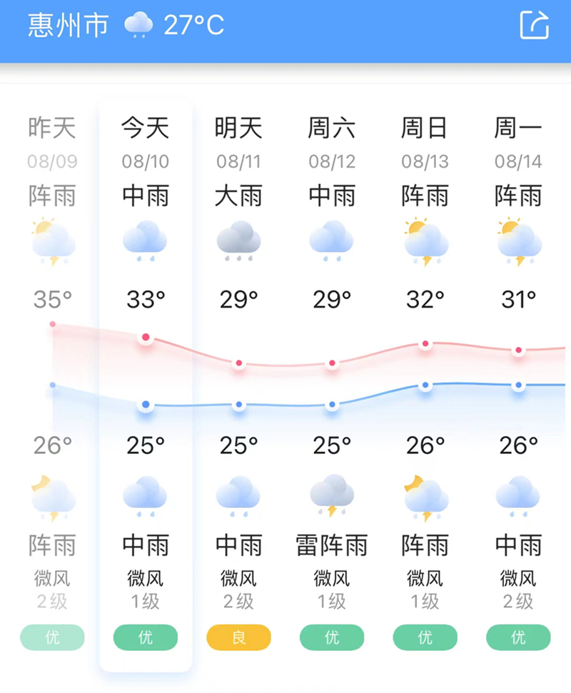 惠州市氣象臺預測,10-12日,惠州各地降水趨于明顯,并伴有短時強降水、局地6~8級雷暴大風等強對流天氣,過程累積雨量50~80毫米局部150毫米左右。其中,10日多云轉中雷雨,局部暴雨;11日,大雨到暴雨局部大暴雨;12日,大雨到暴雨。
