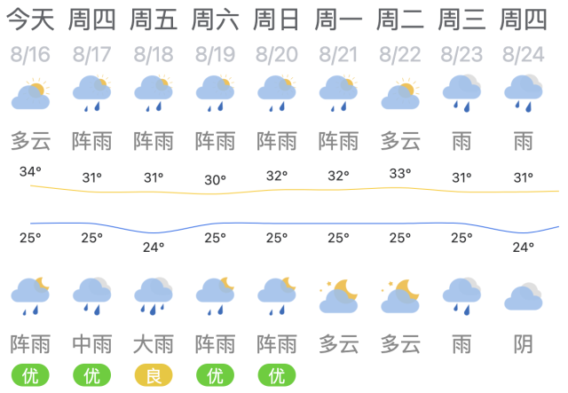 預(yù)計(jì),今天白天,我市各地多云天氣為主,有分散雷陣雨,最高氣溫35℃左右;