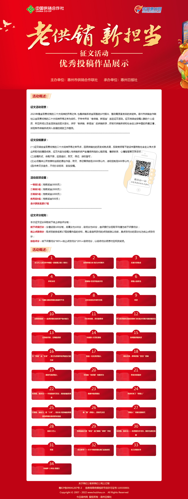 根據(jù)征文要求,要結(jié)合全面貫徹黨的二十大精神開局之年特點(diǎn),反映在黨的領(lǐng)導(dǎo)下,供銷合作事業(yè)所取得的矚目成就,回顧供銷社的歷史點(diǎn)滴,征文內(nèi)容為投稿人與供銷系統(tǒng)產(chǎn)生情感共鳴的心路歷程、情感故事、心情隨筆等文字素材,文體以散文、傳記、詩歌為主。經(jīng)評(píng)委精選,部分稿件將進(jìn)行線上展示收集點(diǎn)贊,并綜合評(píng)委得分及點(diǎn)贊數(shù)評(píng)出作品排名。活動(dòng)主辦方邀請(qǐng)廣大讀者掃碼進(jìn)入點(diǎn)贊頁面,點(diǎn)贊喜愛的作品。