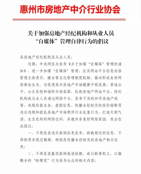 日前,記者從惠州市住房和城鄉(xiāng)建設(shè)局獲悉,在該局指導(dǎo)下,惠州市房地產(chǎn)中介行業(yè)協(xié)會正式發(fā)布《關(guān)于加強房地產(chǎn)經(jīng)紀(jì)機構(gòu)和從業(yè)人員“自媒體”管理自律行為的倡議》(以下簡稱《自律倡議》),倡議共同構(gòu)建天朗氣清、生態(tài)良好的網(wǎng)絡(luò)空間,為惠州房地產(chǎn)市場健康平穩(wěn)發(fā)展?fàn)I造公平、公正良性和諧的市場氛圍。