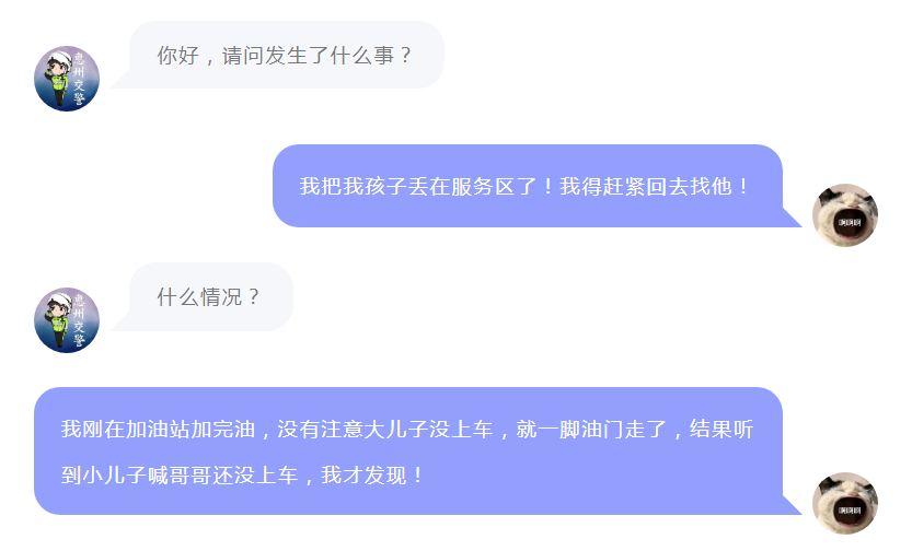 經(jīng)核實,該男孩確為被“丟”的大兒子,其在母親去交費時自己下車上洗手間了,待出來時就發(fā)現(xiàn)車輛已經(jīng)不在了。民警了解完情況后,馬上帶著男孩來到服務區(qū)出口處與其母親會合。