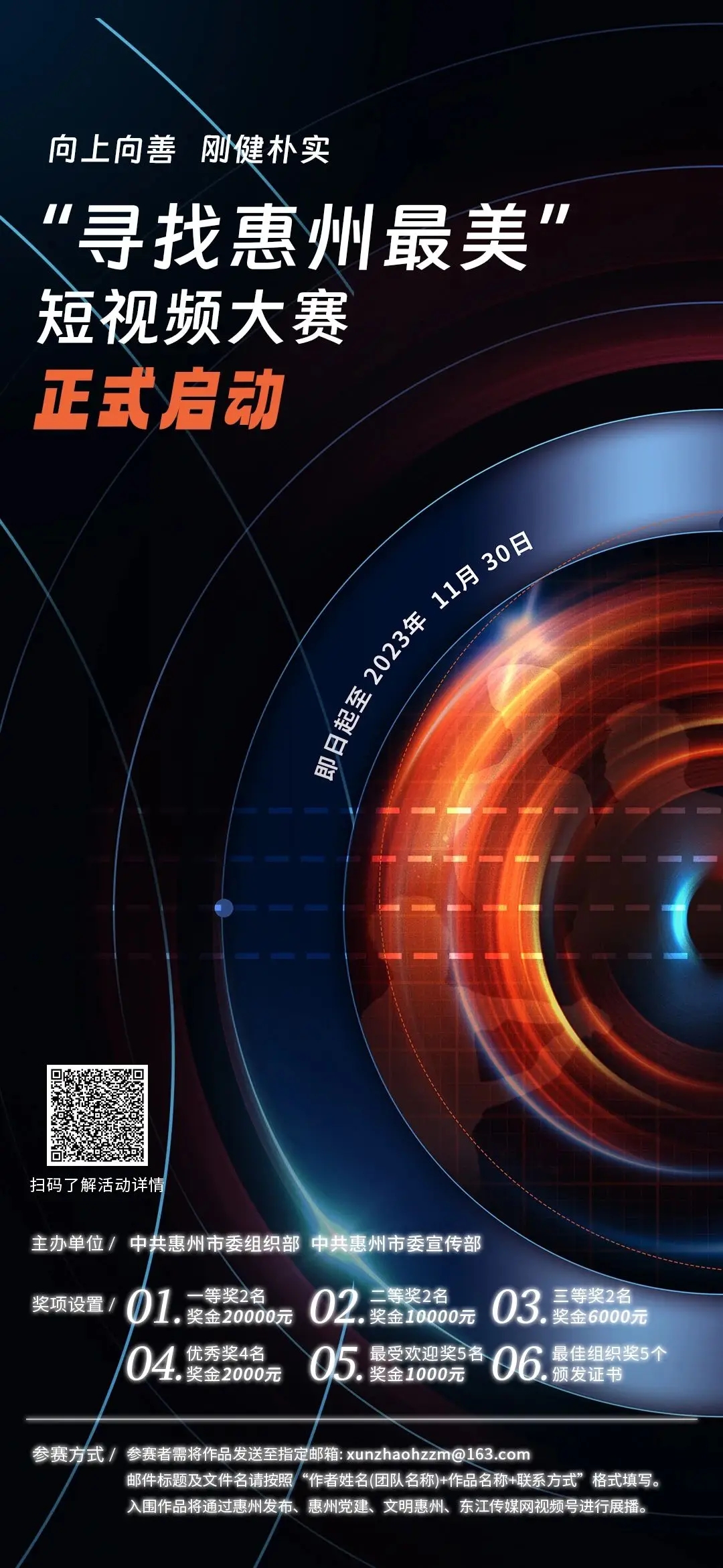 入圍作品將通過(guò)惠州發(fā)布、惠州黨建、文明惠州、東江傳媒網(wǎng)視頻號(hào)進(jìn)行展播。大賽將評(píng)選出一等獎(jiǎng)2名(獎(jiǎng)金各20000元)、二等獎(jiǎng)2名(獎(jiǎng)金各10000元)、三等獎(jiǎng)2名(獎(jiǎng)金各6000元)、優(yōu)秀獎(jiǎng)4名(獎(jiǎng)金各2000元)、最受歡迎獎(jiǎng)5名(獎(jiǎng)金各1000元)、最佳組織獎(jiǎng)5個(gè)(頒發(fā)證書(shū))。