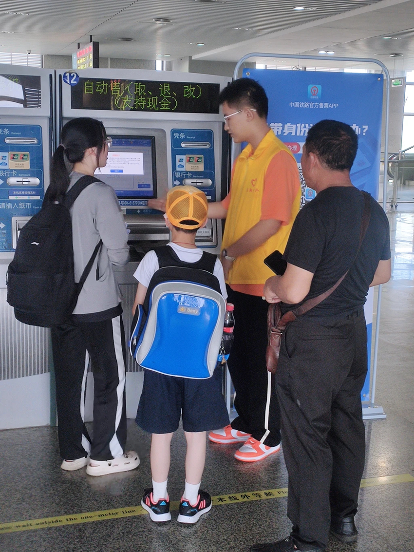 志愿者為過往旅客提供自助購票指導、 路線引導等多項服務(wù)。