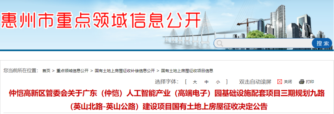 位于廣東(仲愷)人工智能產(chǎn)業(yè)(高端電子)園基礎(chǔ)設(shè)施配套項目三期規(guī)劃九路(英山北路-英山公路)建設(shè)項目國有土地上房屋和其他建(構(gòu))筑物(詳見衛(wèi)星影像圖),征收范圍內(nèi)的房屋被依法征收后,國有土地使用權(quán)同時收回。
