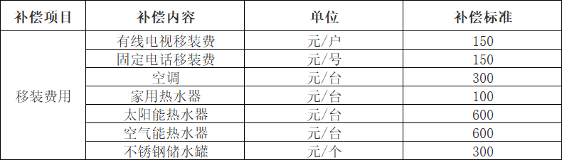 (二)被征收房屋的移裝費用(空調(diào)、家用熱水器、太陽能熱水器、空氣能熱水器、不銹鋼儲水罐)按照下表標準執(zhí)行: