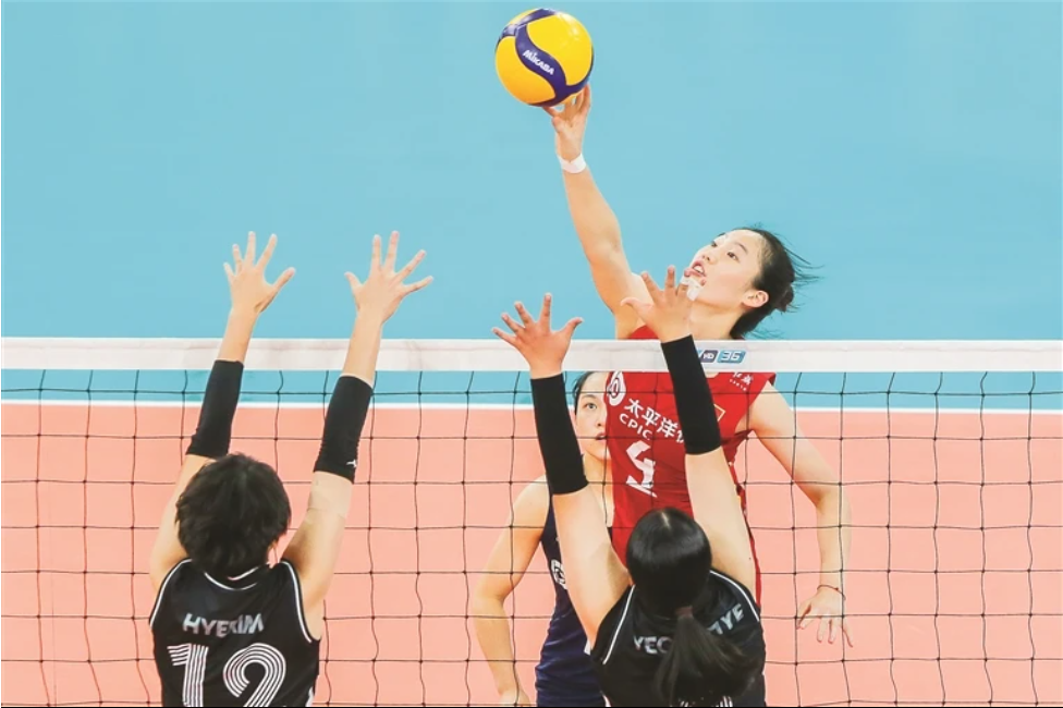8月21日,中國隊(duì)球員王逸凡(上)在比賽中扣球。新華社發(fā)