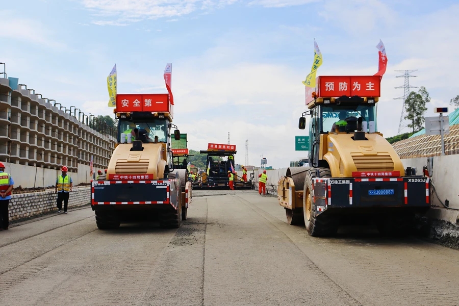 墊層是路面和路基間的承接結(jié)構(gòu)層,主要由碎石混合料組成,具有排水、隔熱等功能,保證路面和路基的強(qiáng)度及穩(wěn)定性。據(jù)介紹,惠河高速改擴(kuò)建項(xiàng)目路面墊層試驗(yàn)段位于惠州西服務(wù)區(qū)T9標(biāo)段,墊層長度500米、寬度約10.5米,采用兩臺攤鋪機(jī)梯隊(duì)式連續(xù)攤鋪施工,共計(jì)攤鋪混合料約2300噸。