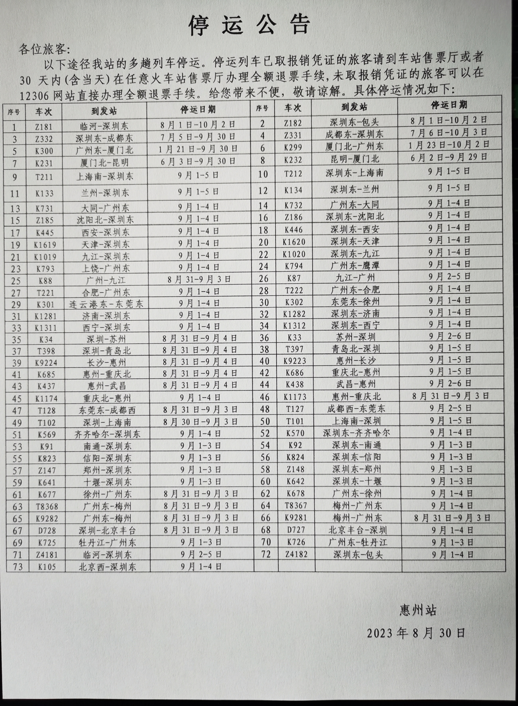 記者從惠州火車站獲悉,9月1日至3日,惠州火車站所有列車停運。