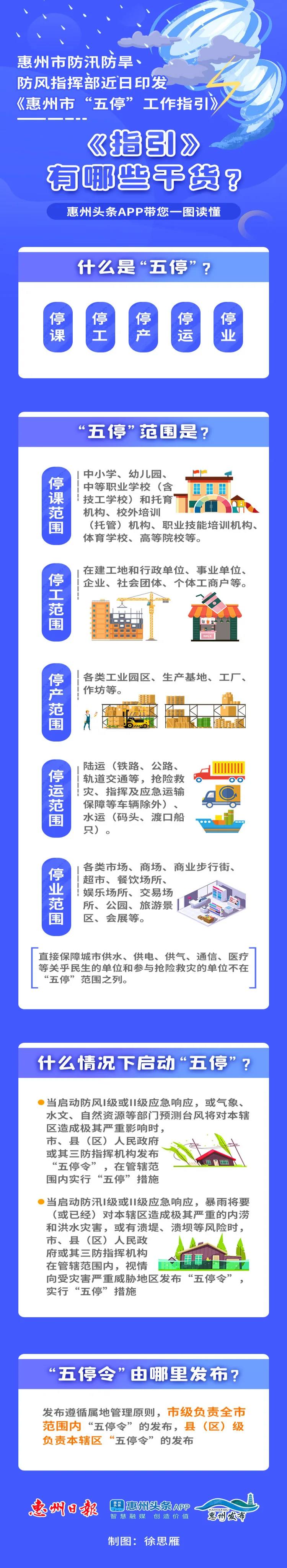 《惠州市“五!惫ぷ髦敢诽嵝,公眾應(yīng)密切關(guān)注臺風(fēng)、暴雨、洪水預(yù)警信息和“五停令”發(fā)布情況,自覺遵守人民政府及相關(guān)部門的工作部署和指令。未按照規(guī)定停課、停工、停產(chǎn)、停運、停業(yè)的,依據(jù)《廣東省防汛防旱防風(fēng)條例》及其他法律法規(guī)規(guī)定,追究其責(zé)任。