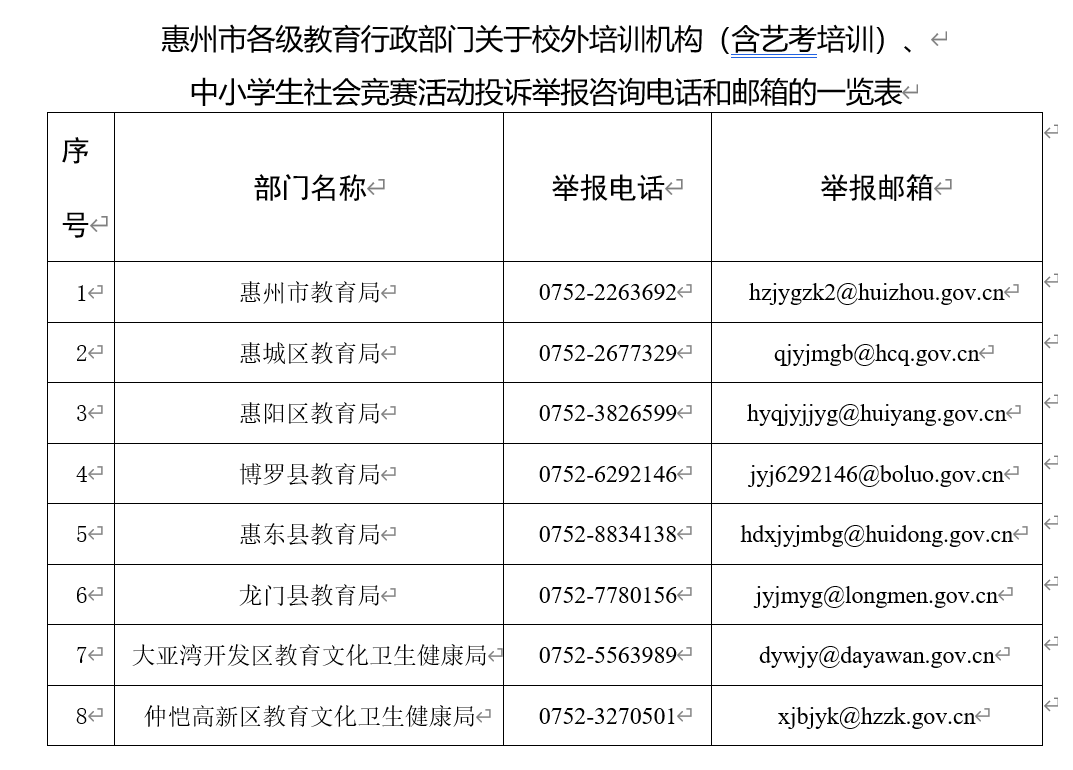 8月29日,惠州市教育局發(fā)布《關(guān)于公布惠州市中小學(xué)生校外培訓(xùn)(含藝考培訓(xùn))、中小學(xué)生社會(huì)競賽活動(dòng)投訴舉報(bào)咨詢電話和郵箱的公告》,凡是涉及校外培訓(xùn)機(jī)構(gòu)(含藝考培訓(xùn))資質(zhì)、課程、師資、招生、收費(fèi)、侵害未成年人身心健康等方面問題,以及面向中小學(xué)生的各類社會(huì)競賽活動(dòng)問題都可以舉報(bào)。