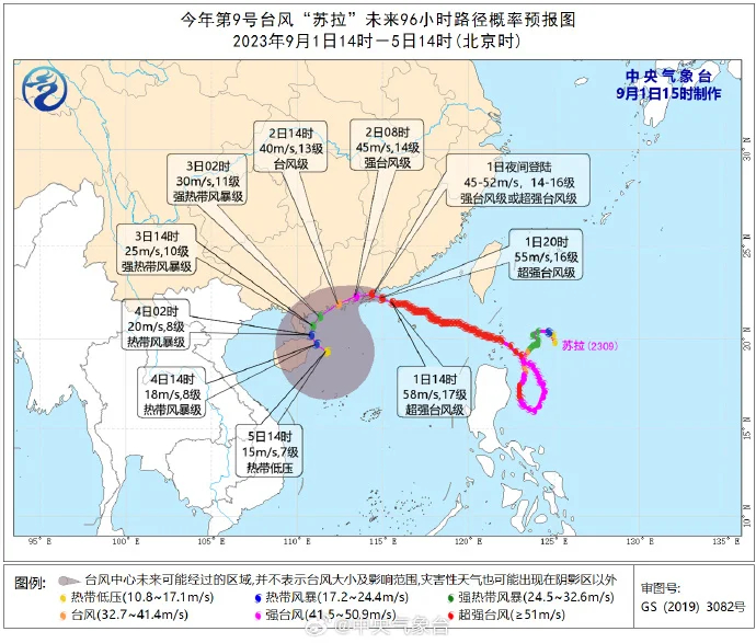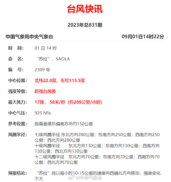 下午14時,超強臺風“蘇拉”中心附近最大風力17級(58米/秒)。預計,“蘇拉”將以每小時10~15公里的速度向西偏北轉(zhuǎn)偏西方向移動,將于今天夜間到明天上午以強臺風級或超強臺風級在廣東惠東到臺山一帶沿海登陸,也不排除在廣東中部近岸海面向西偏南方向移動的可能。