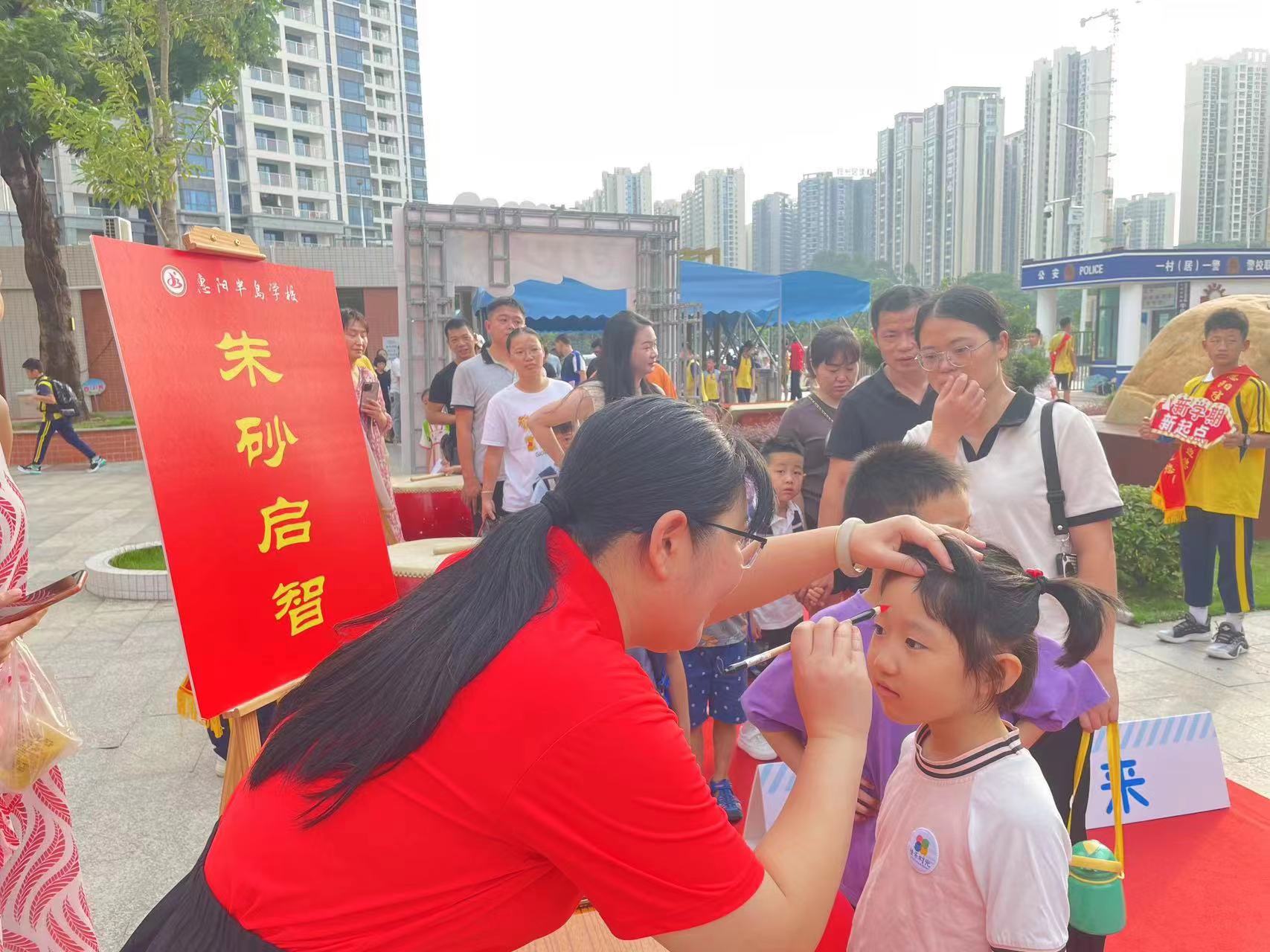 9月4日上午,惠陽半島學校舉行了以“加油開學季,筑夢向未來”為主題的新生入學儀式。學校為孩子們設(shè)置了“向陽生長”“筑夢未來”“心向未來”字樣的跨欄,每個跨欄以及水果代表著學校對孩子們的美好祝愿,希望他們光芒初綻,一步一個腳印,奔赴燦爛前程?鐧谥缶褪菗艄拿髦荆恳宦暪穆暥荚杏粋嶄新的希望,這一儀式飽含著惠陽半島學校對孩子們的殷切期望,望其目明耳聰、茅塞頓開、創(chuàng)業(yè)建功。額點朱砂,啟蒙開智。在朱砂點痣環(huán)節(jié),老師們在每一個孩子的眉心點上一顆朱砂痣,寓意打開了稚童們的求學之門、鋪砌了人生的行走之路。學校特意設(shè)置了新生拍照打卡點,孩子們有序地打卡拍照,留下一張張開心的笑臉,記錄下進入小學的美好瞬間。