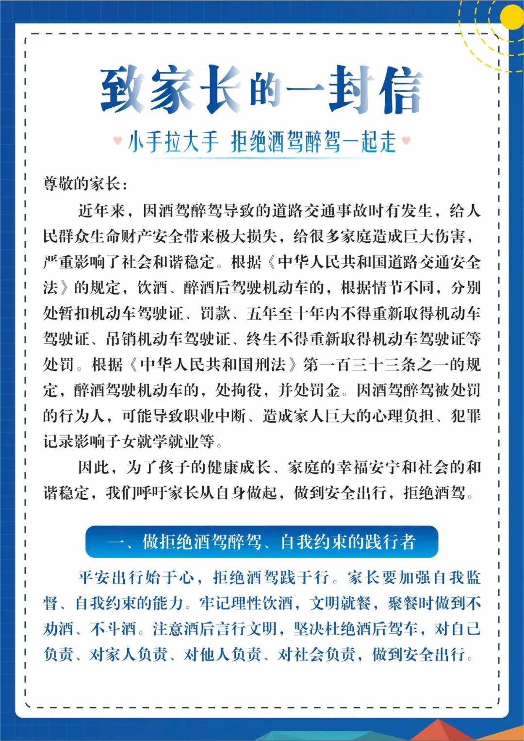 惠東縣檢察院通過微信公眾號向社會公眾發(fā)出的致家長的一封信《小手拉大手,拒絕酒駕醉駕一起走》,由該院未檢部門聯(lián)合教育部門向全縣各學(xué)校進行轉(zhuǎn)發(fā)及線上簽閱。