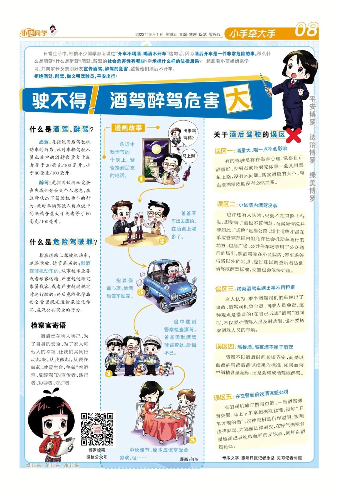 惠州檢察機關(guān)積極開展“小手拉大手”系列活動,通過定制普法法治報、送法進校園、致家長的一封信、簽訂拒絕酒后駕駛承諾書等方式,將預(yù)防酒醉駕宣傳工作從社會延伸至學(xué)校反饋到家庭,充分發(fā)揮孩子在家庭日常生活中拒絕酒駕醉駕宣傳員和監(jiān)督員的作用,實現(xiàn)小家庭帶動大社會,營造良好的社會氛圍。博羅縣檢察院于秋季開學(xué)推出定制的“法治報”,報刊內(nèi)容包含整版預(yù)防酒醉駕宣傳內(nèi)容,共計贈閱12.6萬余份,覆蓋博羅縣所有小學(xué)生。