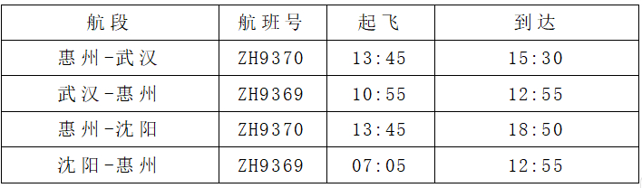 新增惠州=武漢=沈陽航線