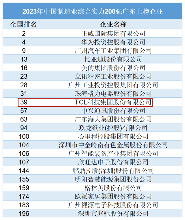 “100強(qiáng)榜單”中,惠州上榜的企業(yè)是TCL科技集團(tuán)股份有限公司,排名第29位。