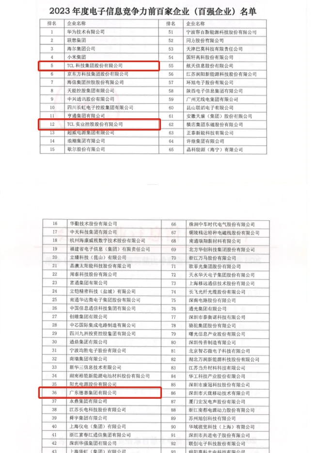 近日,中國電子信息行業(yè)聯(lián)合會在廈門發(fā)布2023年度電子信息企業(yè)競爭力報(bào)告及前百家企業(yè)名單,惠州3家企業(yè)入選。其中TCL科技穩(wěn)居榜單第5位,TCL實(shí)業(yè)首次上榜名列第12位,廣東德賽集團(tuán)有限公司位列第36位。