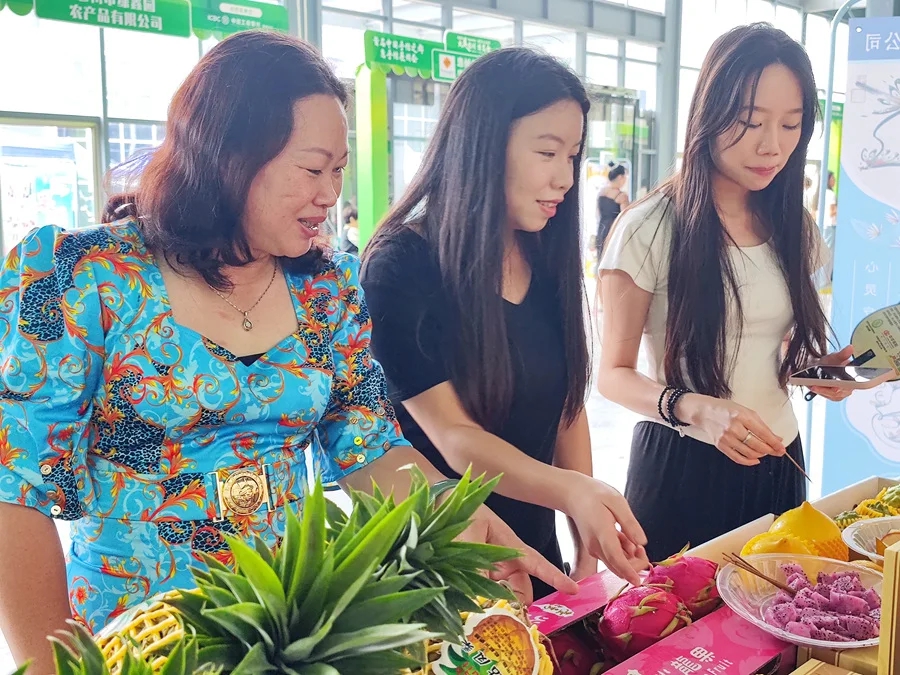 “第一次看果肉是粉紅色的火龍果,吃起來有玫瑰蜜味,好特別!”市民戴女士品嘗后當(dāng)即購買一箱。“我們是用含有益生菌的肥料來種植的,就像給火龍果喝牛奶!辈┝_縣豐匯農(nóng)業(yè)專業(yè)合作社負(fù)責(zé)人韋金會熱情地向市民推介。當(dāng)天,她還帶來了臺灣鳳梨、釋迦、黃晶果、秋月梨等特色水果。