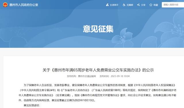 惠州關(guān)于《惠州市年滿65周歲老年人免費(fèi)乘坐公交車(chē)實(shí)施辦法》的公示來(lái)了。