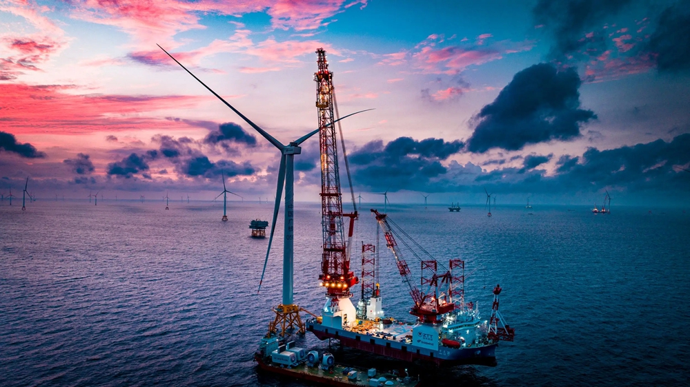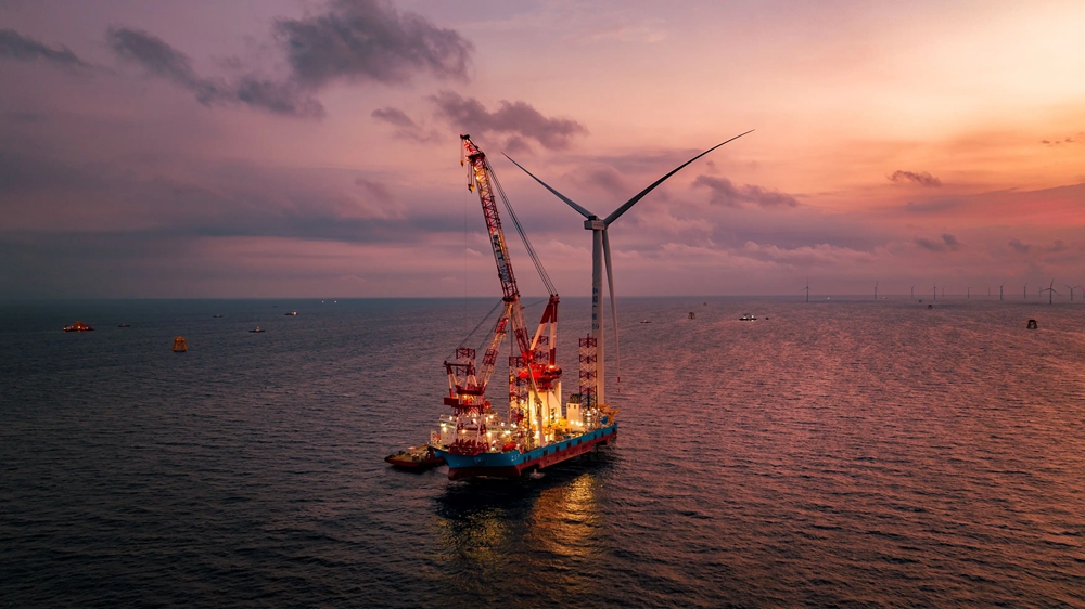 完成安裝的14MW風(fēng)機(jī)在9月23日的朝霞中屹立。