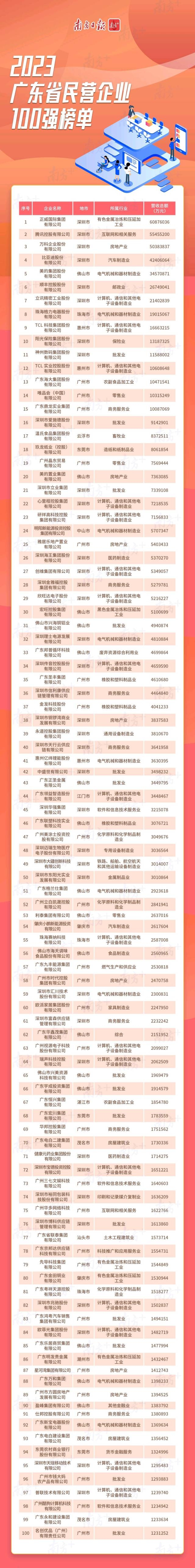 據(jù)悉,“2023廣東省民營企業(yè)100強”入圍門檻為123.13億元,其中2022年營業(yè)收入超過4000億元的企業(yè)有4家,超1000億元的有15家,超200億元的有64家。地區(qū)分布情況:深圳38家,廣州25家,佛山17家,珠海、惠州、東莞、茂名各3家,肇慶2家,汕頭、中山、江門、湛江、潮州、云浮各1家。