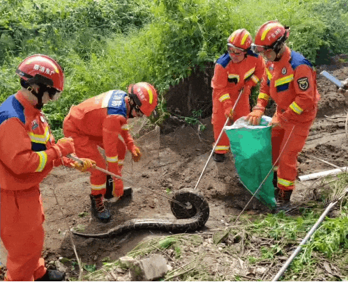 救援人員立即用捕蛇器夾住蟒蛇頭部,將蛇臨時轉移至籠子里,隨后再裝入麻袋中。