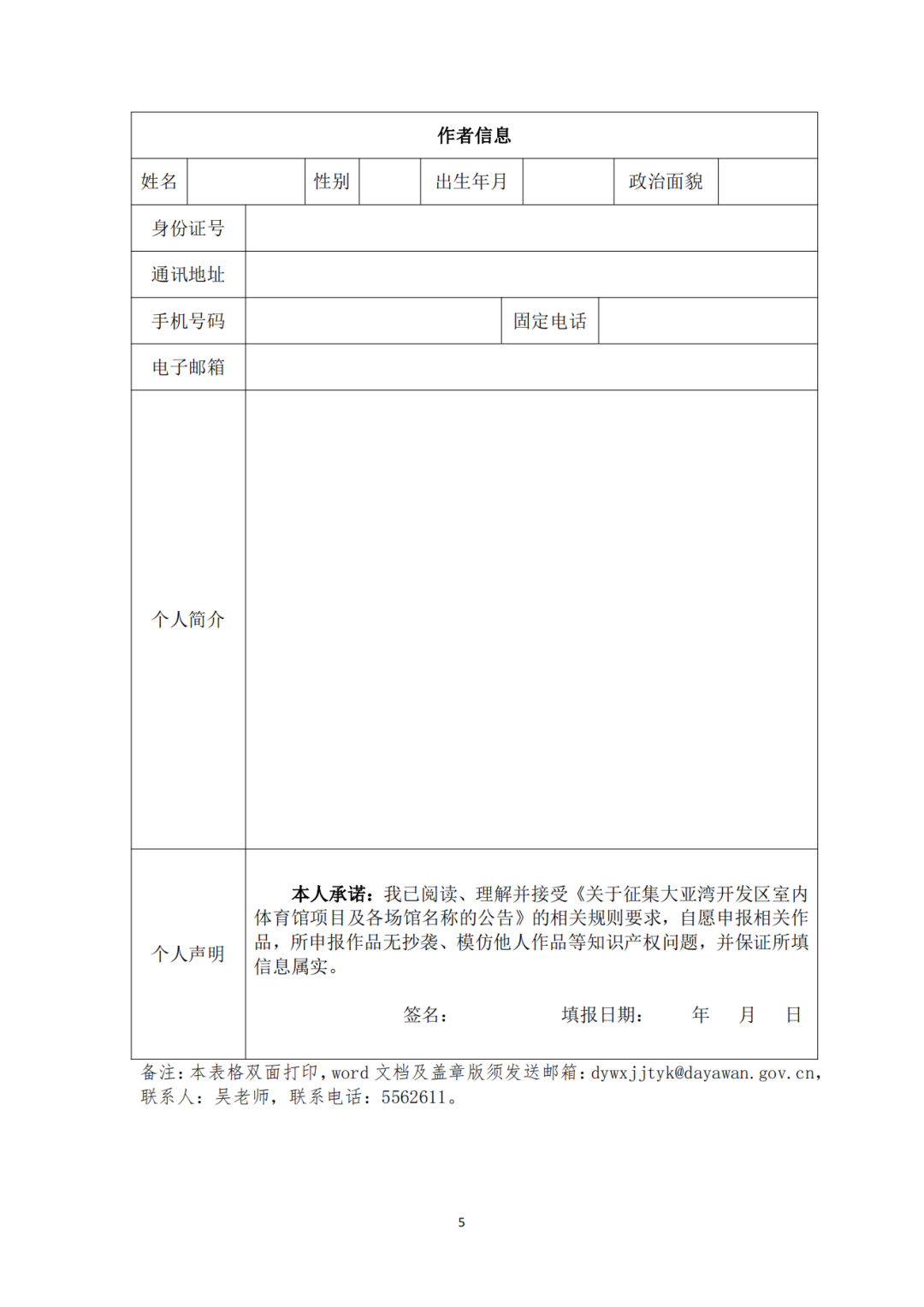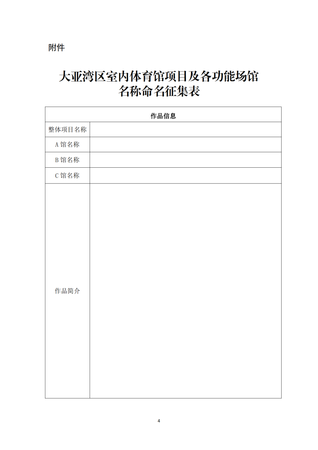 (一)投稿者需填寫《大亞灣區(qū)室內(nèi)體育館項(xiàng)目及各功能場館名稱命名征集表》,提交電子文檔或紙質(zhì)文檔。