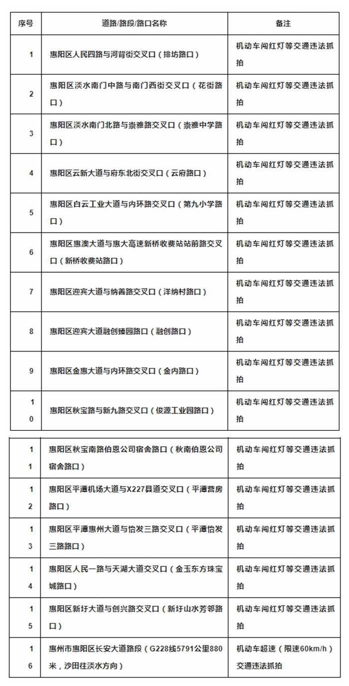 關(guān)于啟用惠陽區(qū)16個點(diǎn)位交通技術(shù)監(jiān)控設(shè)備的公告