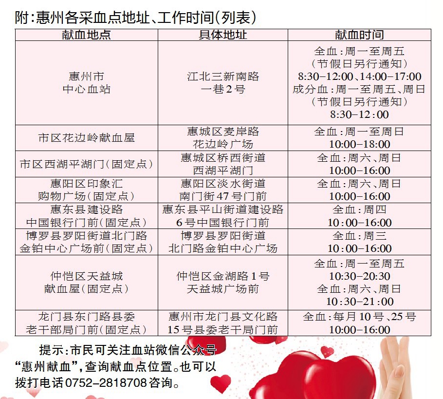 根據(jù)惠州市無償獻(xiàn)血領(lǐng)導(dǎo)小組辦公室發(fā)布的倡議書,科學(xué)獻(xiàn)血無損健康,反而更能刺激骨髓造血,促進(jìn)機體新陳代謝。隨著科普工作的深入,“獻(xiàn)血會影響健康”的誤區(qū)正被逐步消除,但很多“陽康”后的市民對獻(xiàn)血仍存有顧慮。事實上,國家衛(wèi)健委、中央軍委后勤保障部發(fā)布的《關(guān)于印發(fā)血站新冠病毒感染防控工作指引(第二版)》已經(jīng)明確:感染新冠病毒(重型和危重型除外),最后一次新冠病毒核酸檢測或抗原檢測為陰性結(jié)果7天后可以獻(xiàn)血(即“轉(zhuǎn)陰”七天后可以獻(xiàn)血);接種基因重組新冠疫苗與滅活疫苗48小時后也可以獻(xiàn)血。