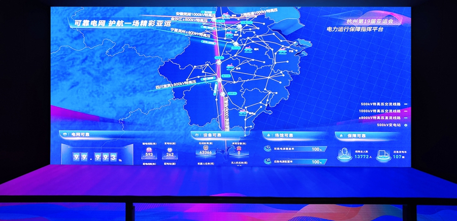 由于本屆亞運會場館分布分散、參與人員和設施眾多、時間跨度大,保障電力可靠穩(wěn)定供應極具考驗性!袄茁怆姙閬嗊\會前線指揮部打造了合計150平方米的雷曼超高清大屏,為亞運會電力保障提供強有力的技術支持!崩茁怆娤嚓P負責人介紹,這款L型大屏由立面電力可視化大屏(分辨率4480×1920)和地面LED電子沙盤(分辨率4480×2240)聯(lián)合呈現(xiàn),是雷曼光電為本屆亞運會電力保障指揮中心特別打造的異形LED顯示屏,實現(xiàn)了包括56個競賽場館、31個訓練場館等在內的近300個亞運保電場所電力數(shù)據(jù)的實時監(jiān)控。