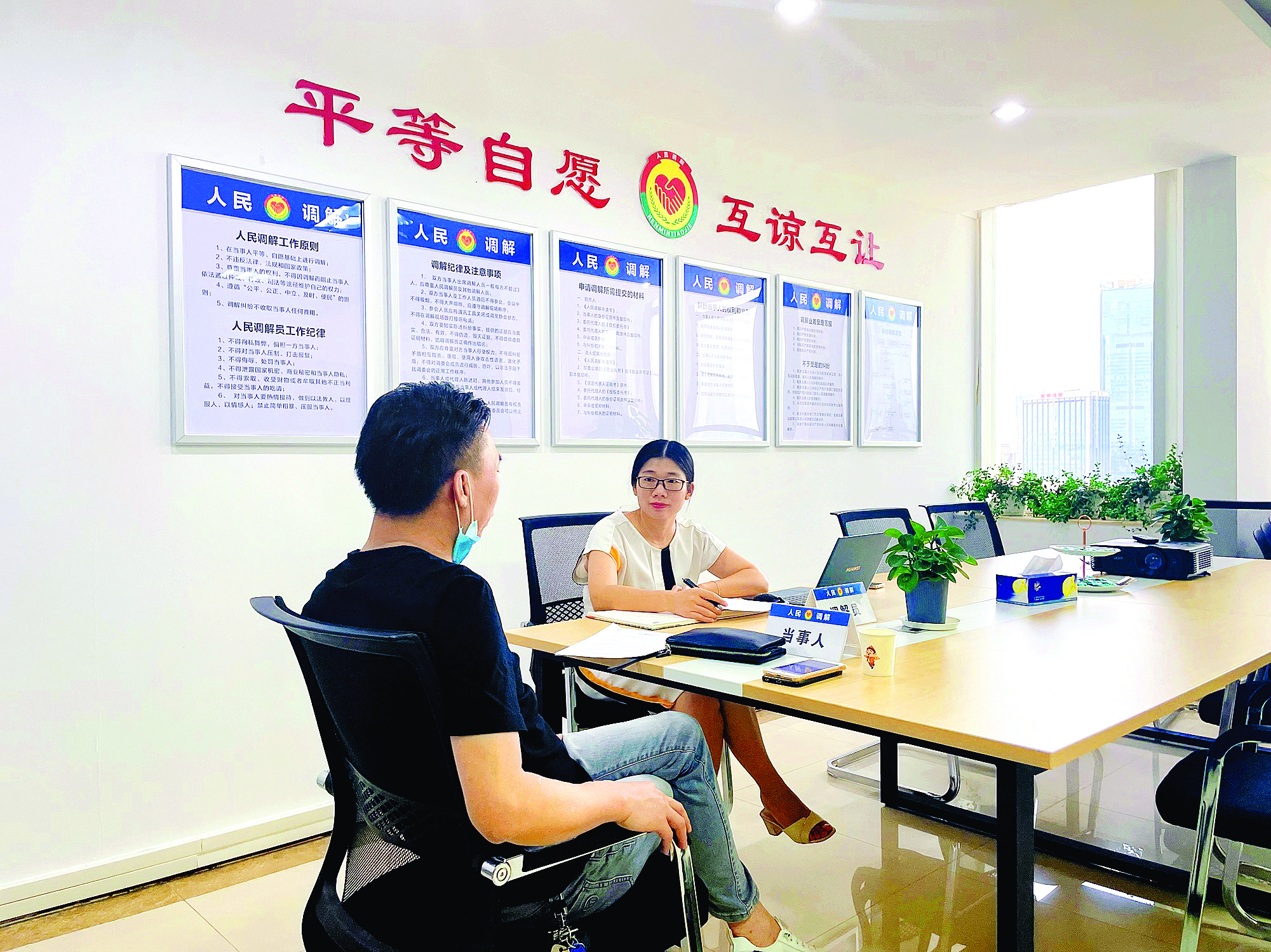 惠州市知識產(chǎn)權糾紛人民調(diào)解委員會調(diào)解員在進行調(diào)解;葜葜{(diào)委供圖