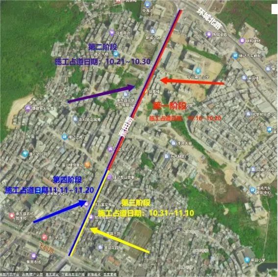 因惠東縣城三聯(lián)生活污水處理廠及蕉田至三聯(lián)片區(qū)配套管網(wǎng)建設工程項目建設需要,需占用蕉田大道(環(huán)城北路交匯處至飛鵝路交匯處)約1100米處的機動車道路路面進行占道圍蔽施工,為了減小對交通影響和保障施工及交通安全,擬定分開四個階段占道圍蔽施工,
