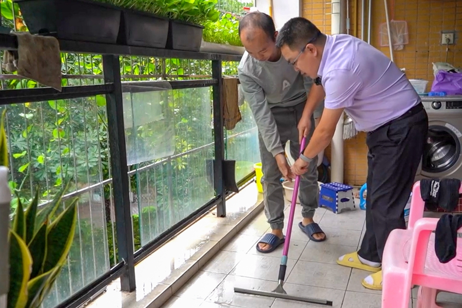 金成(右)教小舅子拖地,學(xué)習(xí)生活技能;葜萑請(bào)記者陳濤 攝