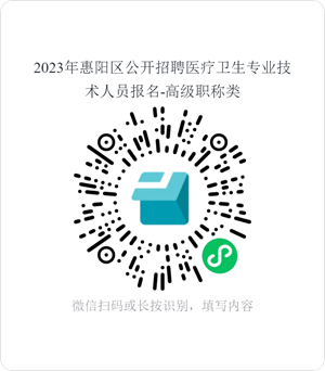 考生掃描二維碼進(jìn)入“2023年惠陽區(qū)公開招聘醫(yī)療衛(wèi)生專業(yè)技術(shù)人員報名(高級職稱類)”,按要求認(rèn)真準(zhǔn)確填寫相關(guān)信息和上傳相關(guān)報名材料。