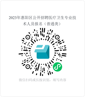 采用微信小程序報名,不接受現(xiàn)場報名?忌鷴呙瓒S碼進(jìn)入“2023年惠陽區(qū)公開招聘醫(yī)療衛(wèi)生專業(yè)技術(shù)人員報名(普通類)”,按要求認(rèn)真準(zhǔn)確填寫相關(guān)信息和上傳相關(guān)報名材料。