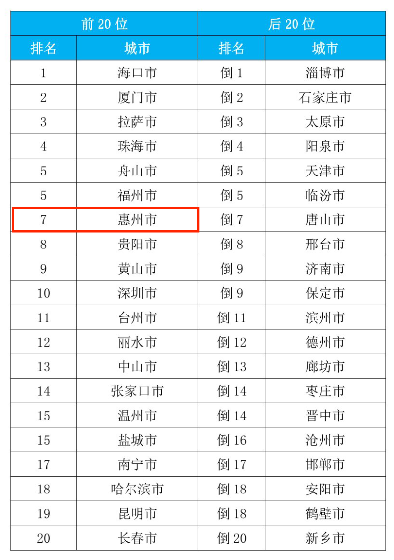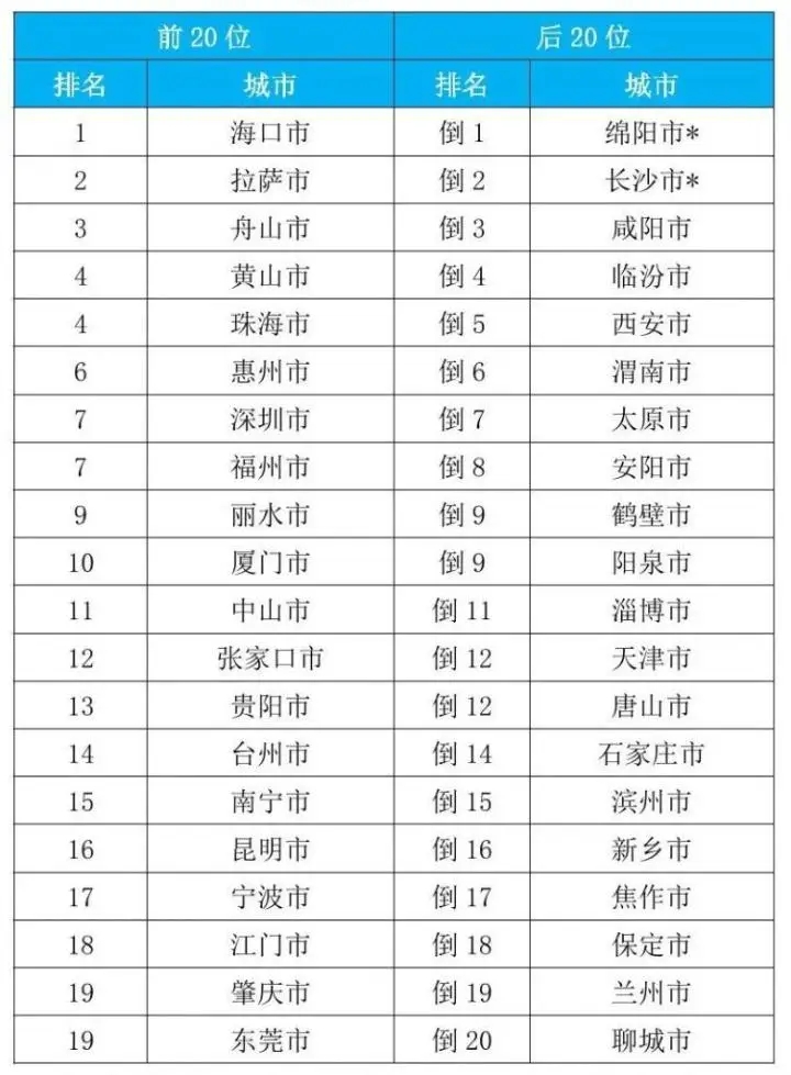 排名前20位和后20位城市名單