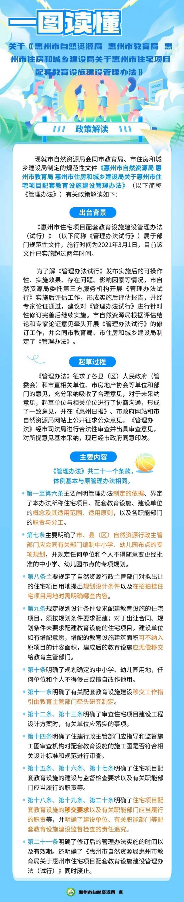 2021年,《惠州市住宅項(xiàng)目配套教育設(shè)施建設(shè)管理辦法(試行)》正式實(shí)施,截至目前已試行三年。在此基礎(chǔ)上,我市新出臺的《管理辦法》進(jìn)一步規(guī)范我市住宅項(xiàng)目配套教育設(shè)施的規(guī)劃、建設(shè)、移交與管理等行為,完善和優(yōu)化教育資源配置,保障適齡兒童和少年就近入學(xué)。