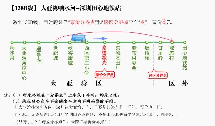 138B線的“跨區(qū)分界線”在大亞灣【塘橫橋】站與深圳【甘角嶺】站之間;“票價分界點(diǎn)”設(shè)在【泰德激光】站。