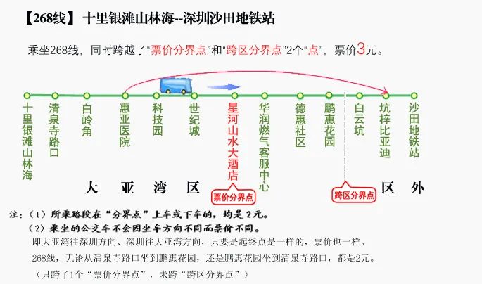 268線的“跨區(qū)分界線”在大亞灣【鵬惠花園】站與惠陽【白云坑】站之間;“票價分界點(diǎn)”設(shè)在【星河山水大酒店】站。