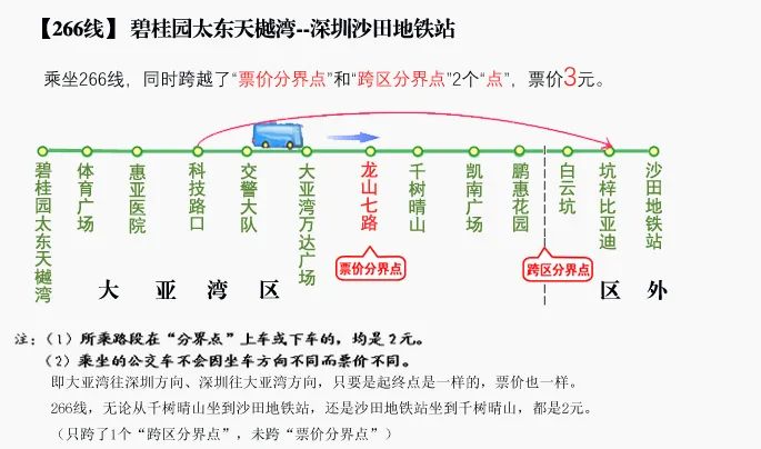 266線的“跨區(qū)分界線”在大亞灣【鵬惠花園】站與惠陽【白云坑】站之間;“票價分界點(diǎn)”設(shè)在【龍山七路】站。