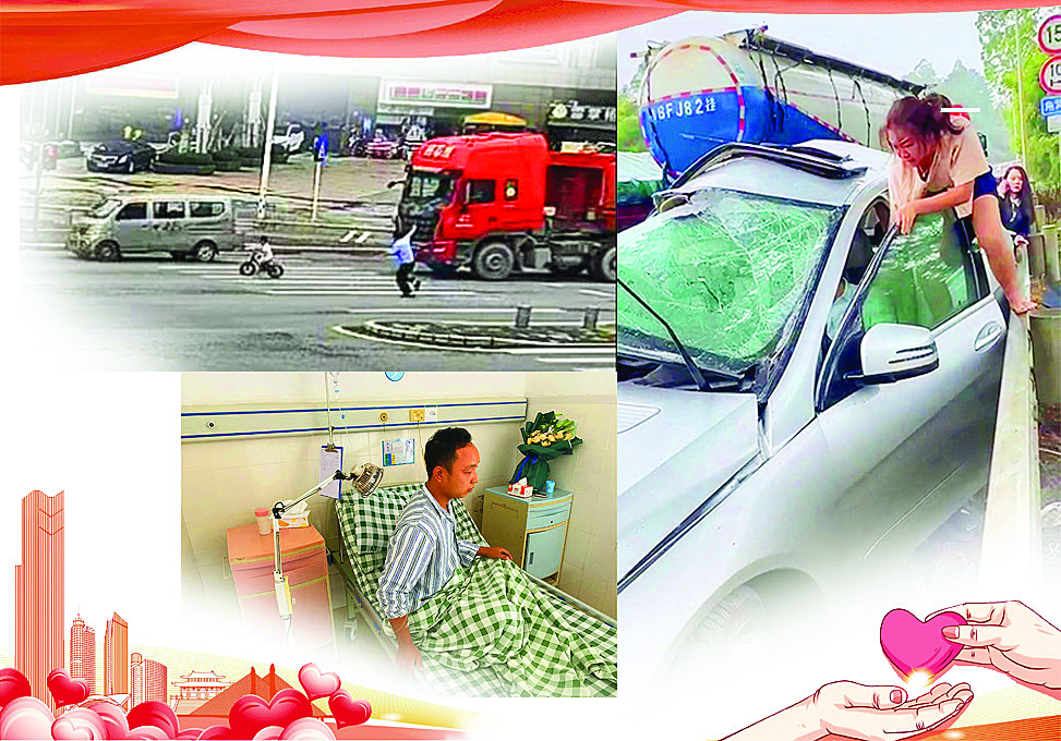 左上:車流中救下男童的“輔警哥”曾勇軍。 左下:擋刀救人的快遞小哥黎志偉。 右:車禍現(xiàn)場(chǎng)奮勇救人的“女俠”溫偉蓮。 惠州東江圖片社供圖