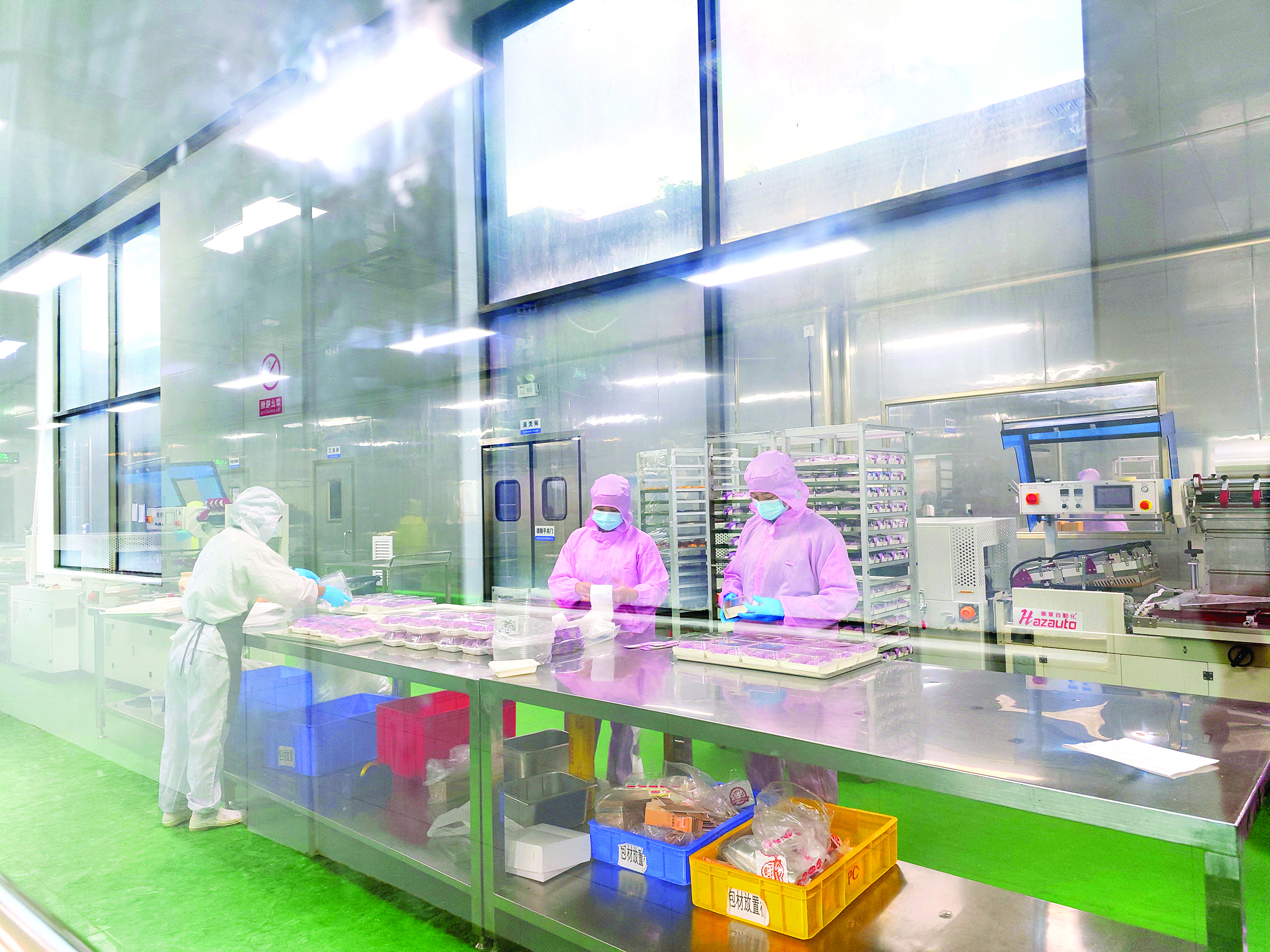 據(jù)介紹,鵬昌農(nóng)業(yè)利用先進(jìn)生產(chǎn)設(shè)備,按照標(biāo)準(zhǔn)化和高質(zhì)量的要求進(jìn)行生產(chǎn),滿(mǎn)產(chǎn)情況下,一天能生產(chǎn)10萬(wàn)個(gè)面包。根據(jù)市場(chǎng)流行風(fēng)向,每隔一段時(shí)間開(kāi)發(fā)新的產(chǎn)品。目前在預(yù)制菜領(lǐng)域,已開(kāi)發(fā)400多種消費(fèi)者喜聞樂(lè)見(jiàn)的產(chǎn)品,年產(chǎn)暢銷(xiāo)產(chǎn)品8000余噸!艾F(xiàn)在我們還開(kāi)發(fā)了加雞蛋的惠靈頓包、牛肉卷、芝士卷等,跟省外多家企業(yè)達(dá)成合作!倍教煺f(shuō),不僅如此,公司還根據(jù)企業(yè)需求,推出了定制服務(wù),例如定制兔子、愛(ài)心、雞蛋形狀的慕斯、動(dòng)畫(huà)聯(lián)名蛋糕、圣誕姜餅人等。