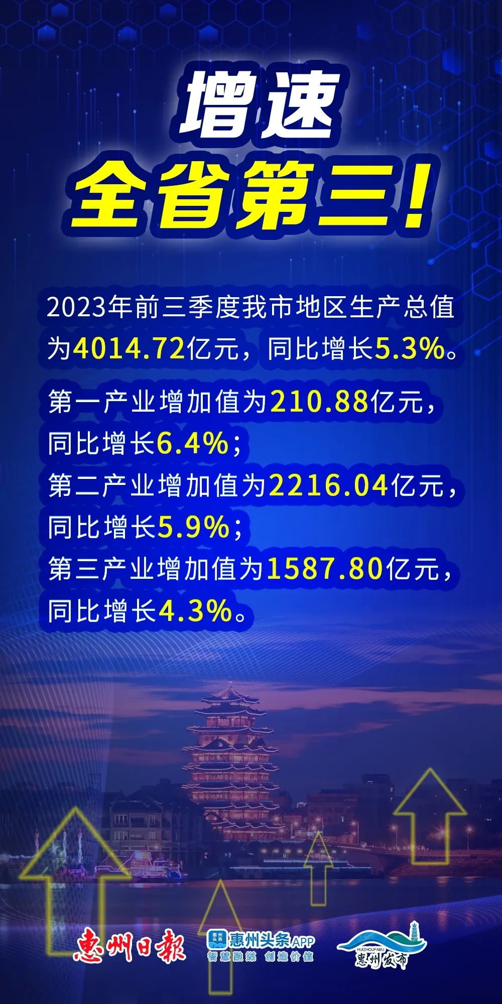 10月24日,惠州今年前三季度經(jīng)濟(jì)運(yùn)行數(shù)據(jù)出爐。根據(jù)地區(qū)生產(chǎn)總值統(tǒng)一核算結(jié)果,2023年前三季度惠州地區(qū)生產(chǎn)總值(GDP)為4014.72億元,同比增長5.3%,增速居全省第三、珠三角第二。