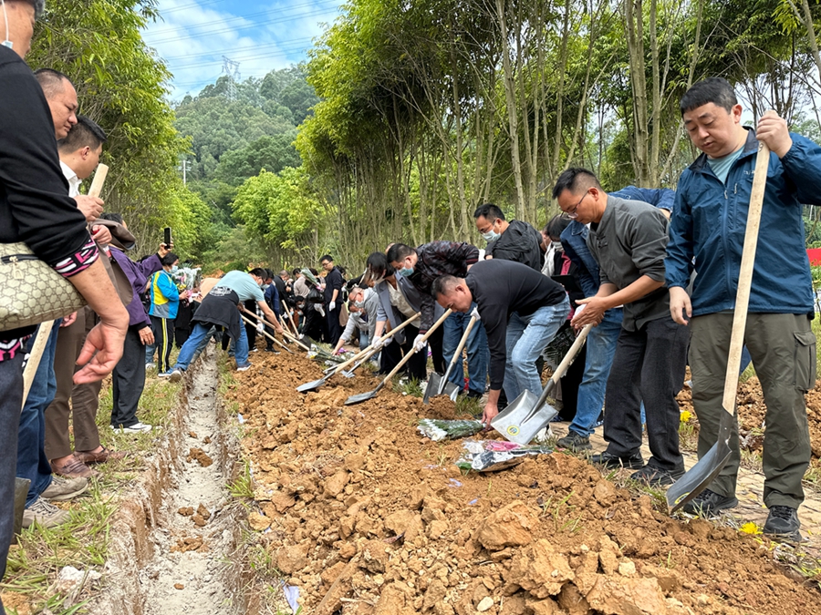 陳先生平靜莊重地將父親的骨灰盒安葬于樹下,“我父親老家在梅州,病逝于2020年,離世前曾和我說過想選擇樹葬簡約處理后事。之前因為疫情三年,都沒有進(jìn)行集體樹葬,今天算是了卻一樁心愿,希望父親和大地同在!睂⒏赣H的骨灰盒埋入樹下后,耿女士終于舒了一口氣,“我的父親上個月過世了,他是個退伍老兵,一輩子勤儉,之前就囑咐我身后事一切從簡,相信他肯定會滿意我為他作的選擇!惫⑴勘硎,之前來祭奠先人的時候,就看到市殯儀館有這個樹葬區(qū),看到這個集體樹葬的活動,就報了名。她認(rèn)為落葉歸根,樹葬是一種綠色生態(tài)、低碳環(huán)保、文明時尚的殯葬方式,既實現(xiàn)了逝者入土為安的愿望,又寓意逝者將生命與樹木融為一體、與自然融為一體、與大地融為一體,讓生命得到延續(xù)和升華。